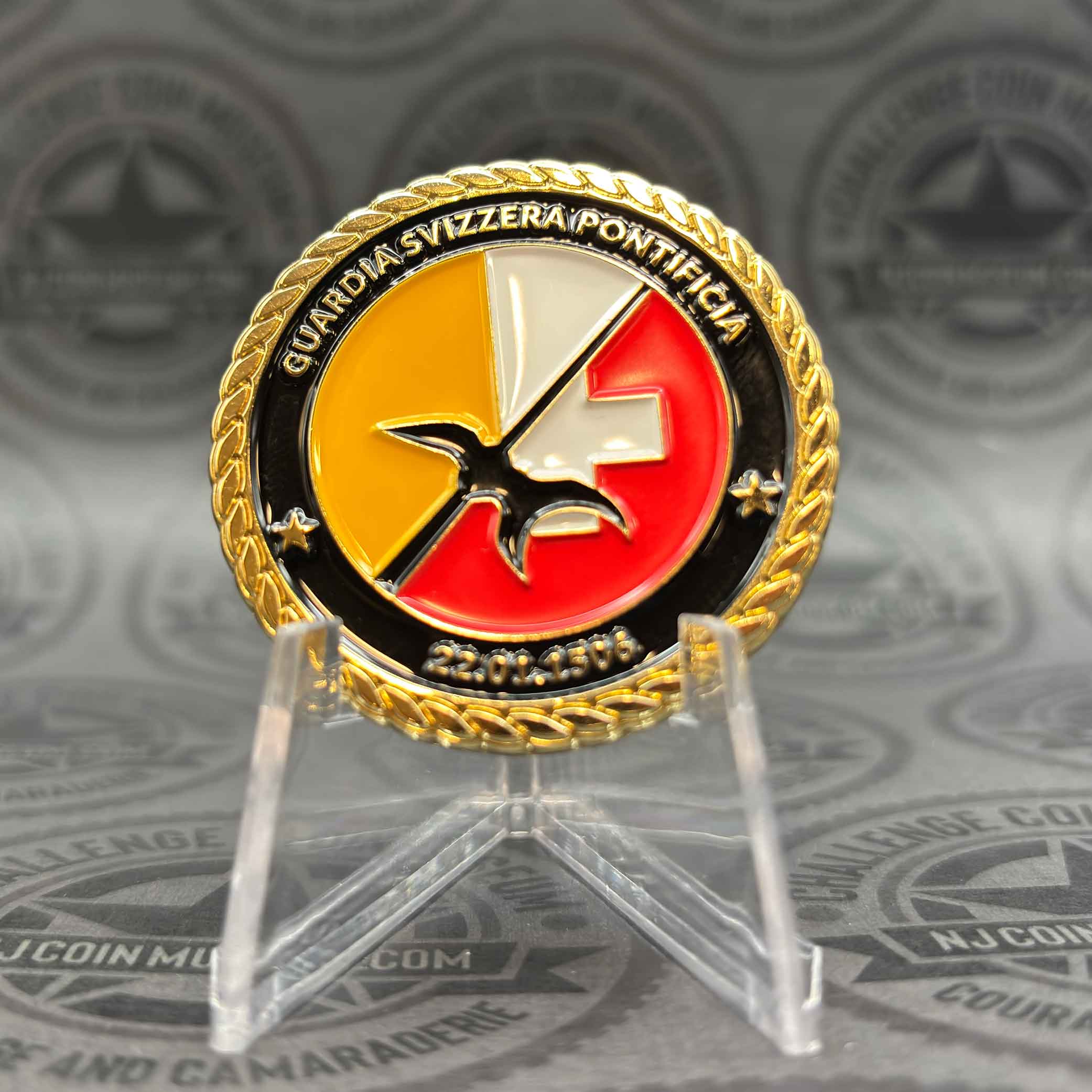 The Guardia Svizzera Pontificia (Pontifical Swiss Guard) challenge coin is a unique symbol of honor and tradition, representing the world’s oldest standing military unit tasked with protecting the Pope and the Vatican since 1506. Bearing the iconic colors inspired by the Renaissance uniforms, as well as the Vatican and Swiss emblems, the coin reflects the