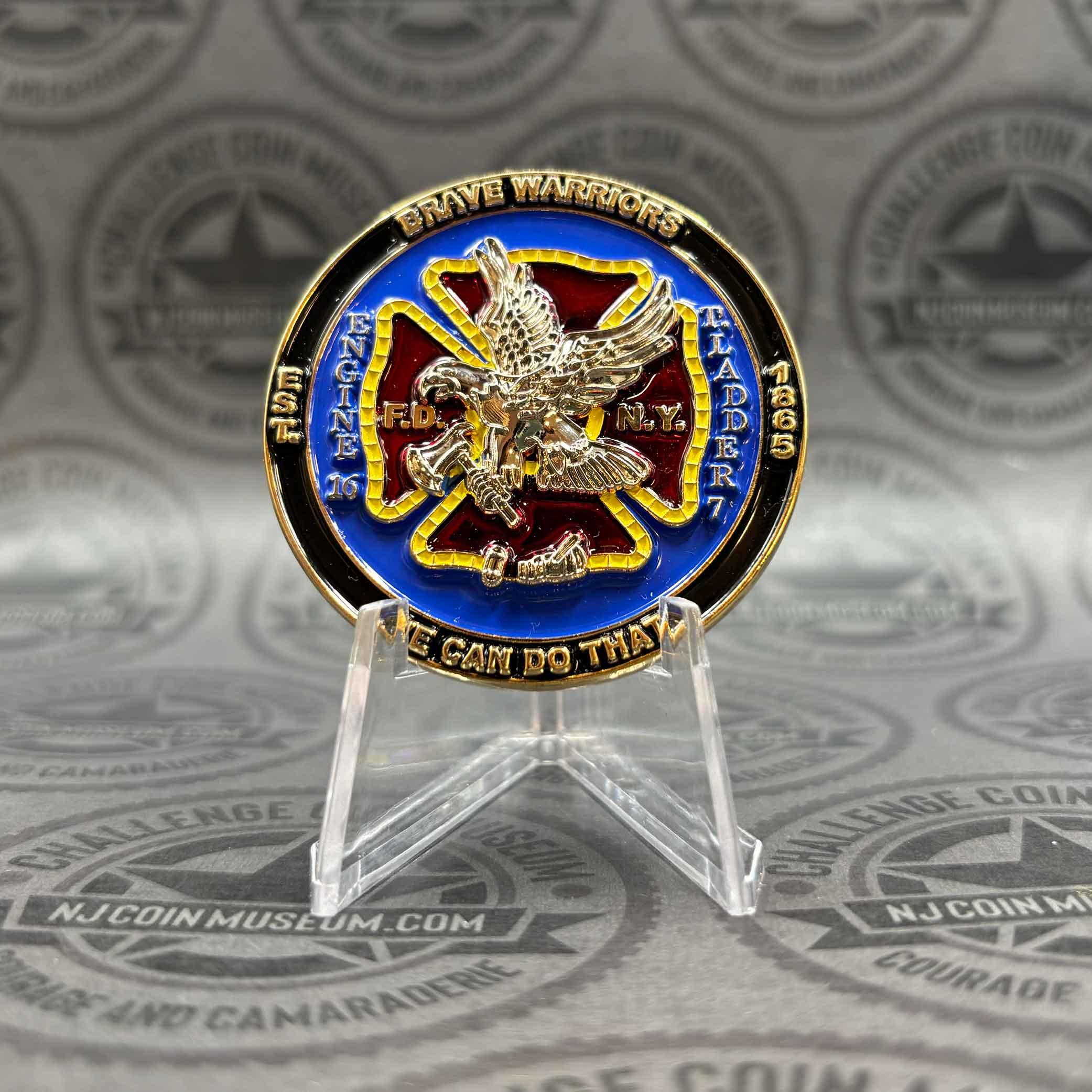 The FDNY Engine 16 / Tower Ladder 7 “Brave Warriors – We Can Do That” challenge coin celebrates the pride, unity, and fearless spirit of this renowned Manhattan firehouse. We invite you to stop in anytime and see this Beautiful Museum! Click HERE for hours and directions. Have a challenge coin we may not have?