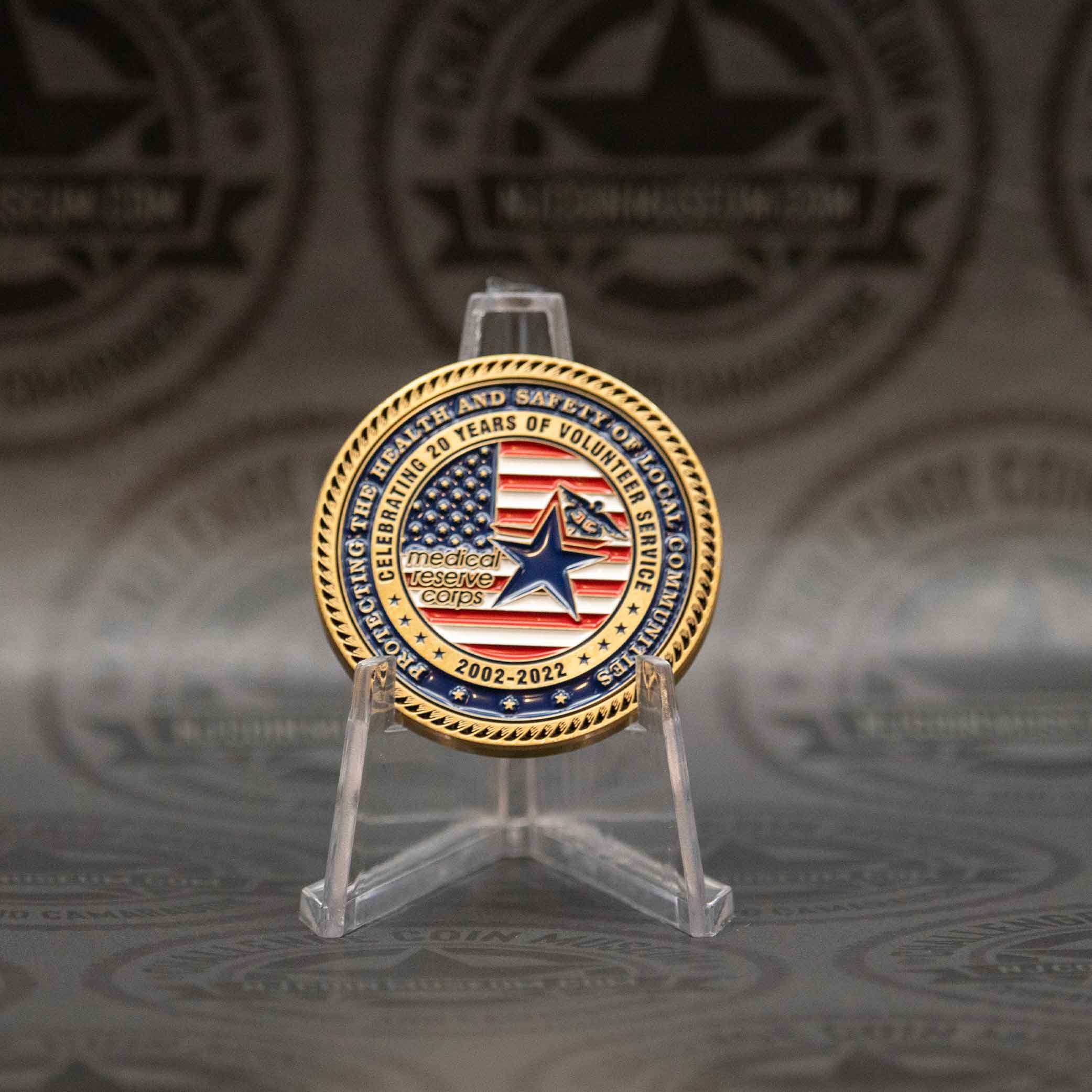 The Medical Reserve Corps “Celebrating 20 Years of Volunteer Service” challenge coin honors two decades of selfless commitment by community-based health volunteers across the U.S. This coin is more than a keepsake: it’s a tangible token of recognition for thousands who’ve volunteered thousands of hours—often saving millions in public resources—during crises like pandemics, natural disasters,