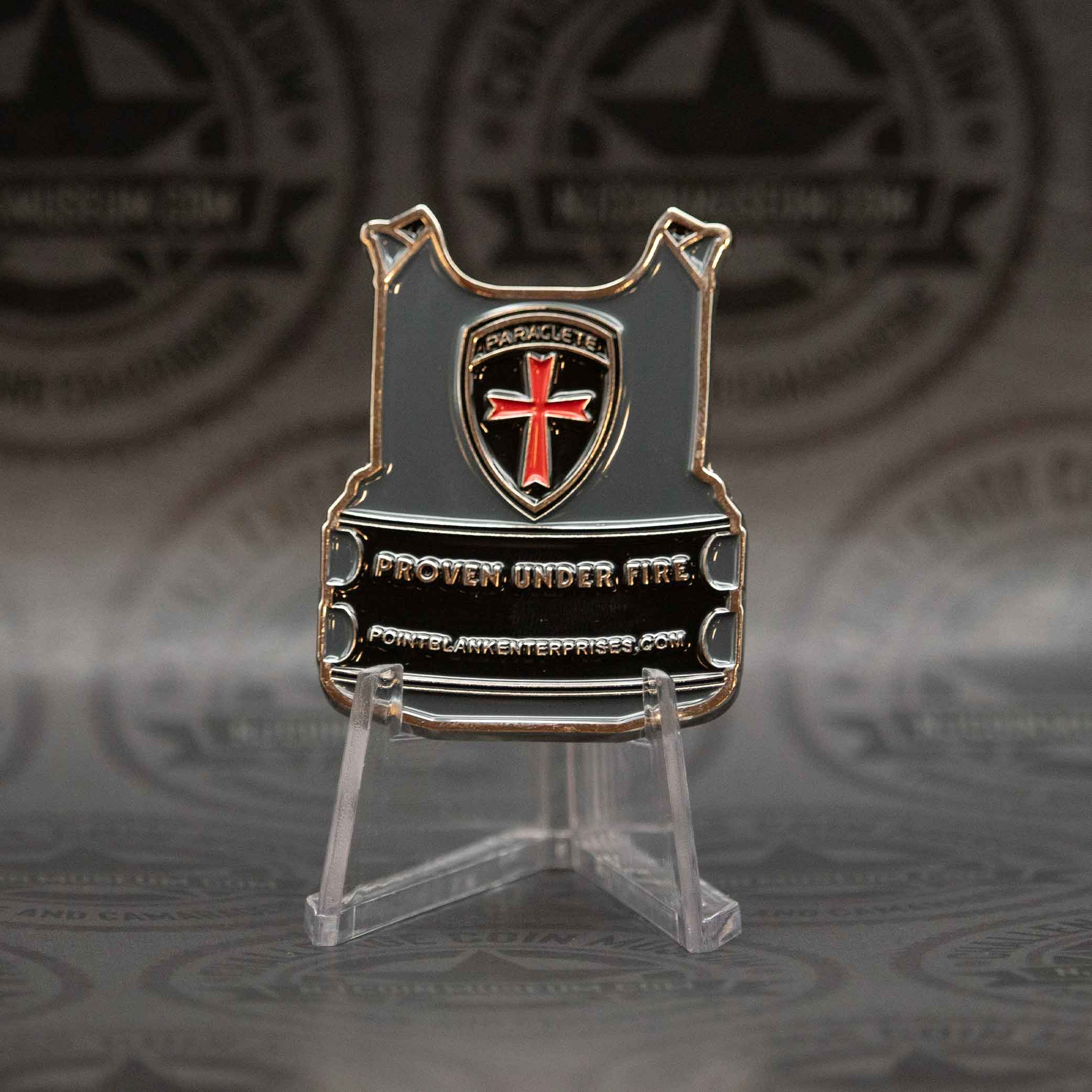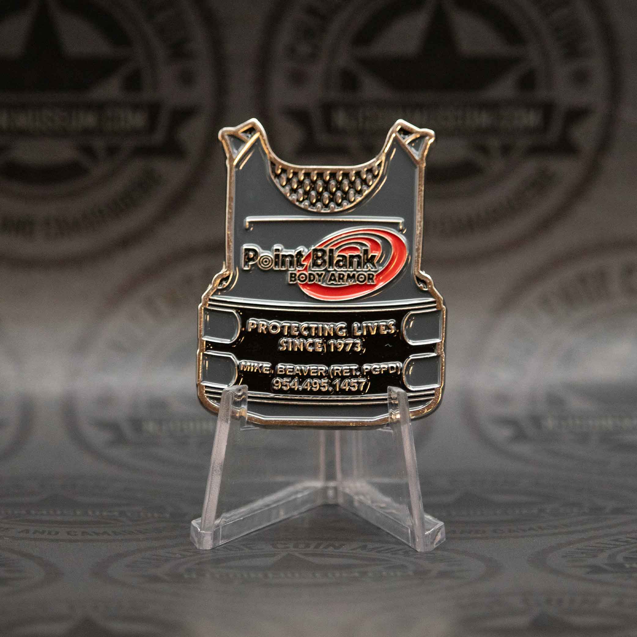 The Point Blank Body Armor challenge coin represents a symbolic tribute to the company’s decades-long commitment to protecting service members, law enforcement officers, and first responders. Established in 1973, Point Blank Enterprises quickly became a leading provider of ballistic armor solutions renowned for reliability and innovation. We invite you to stop in anytime and see this