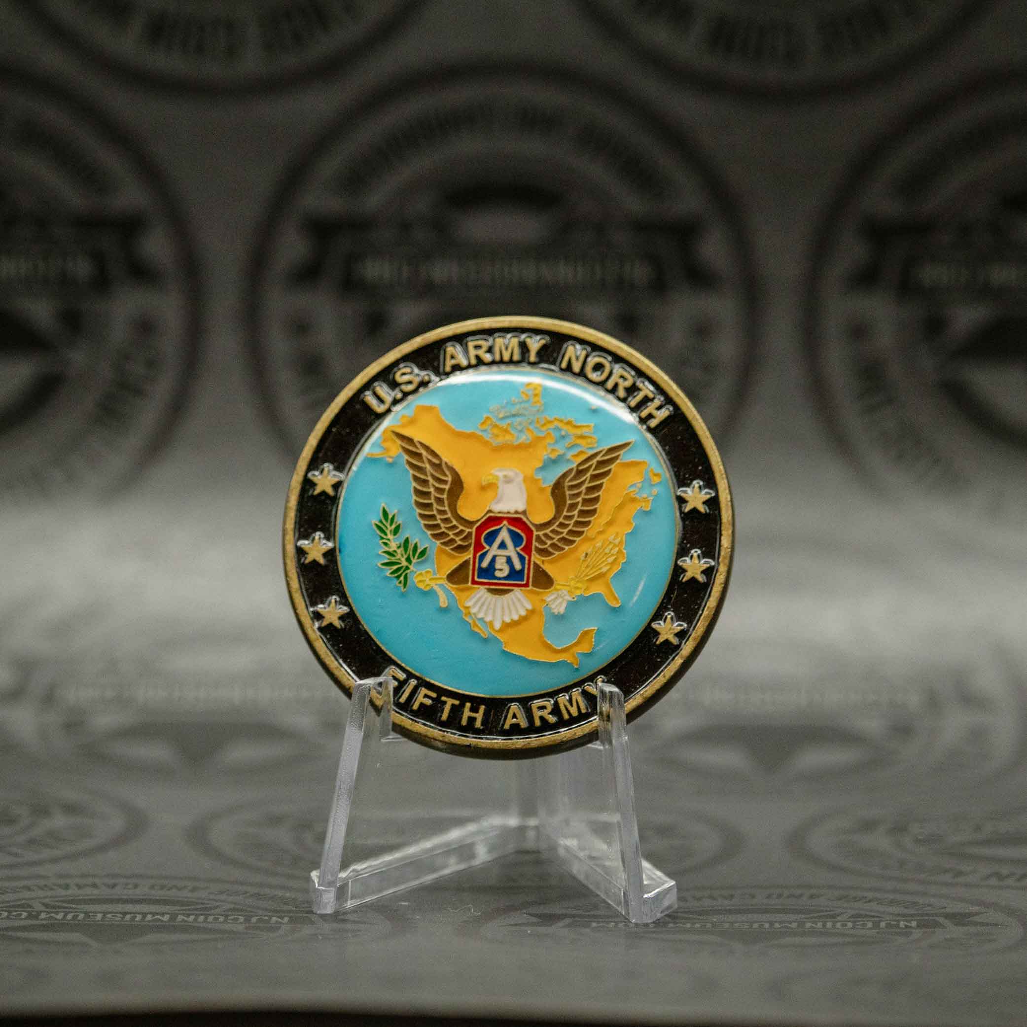 The U.S. Army North (Fifth Army) challenge coin represents the legacy and mission of one of the Army’s oldest and most historically significant commands. Originally activated during World War II, the Fifth Army played a pivotal role in the Italian Campaign and later evolved into U.S. Army North, headquartered at Fort Sam Houston, Texas. Today,