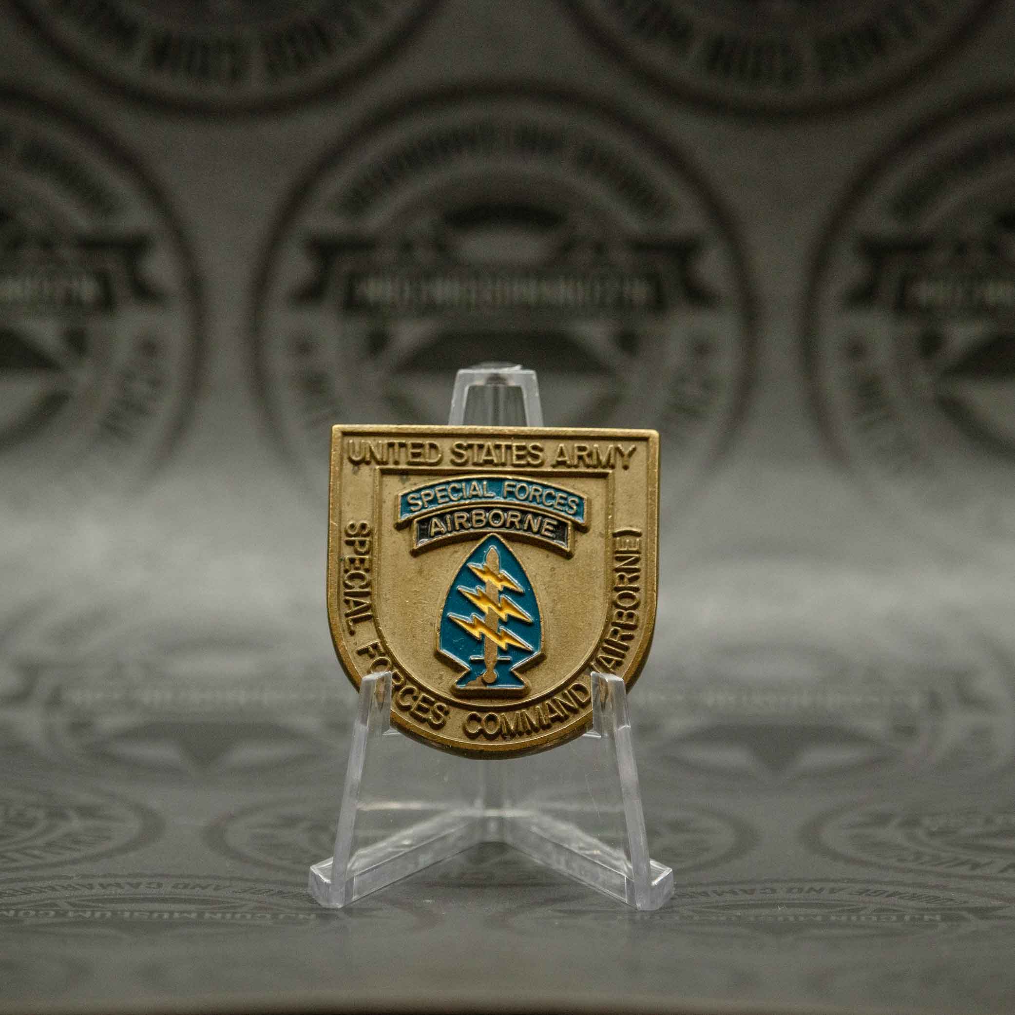 The U.S. Army Special Forces Airborne challenge coin is a prestigious emblem that honors the elite soldiers who serve in the Special Forces with airborne qualification. Often associated with the legendary Green Berets, this coin symbolizes excellence in both unconventional warfare and airborne operations. We invite you to stop in anytime and see this Beautiful