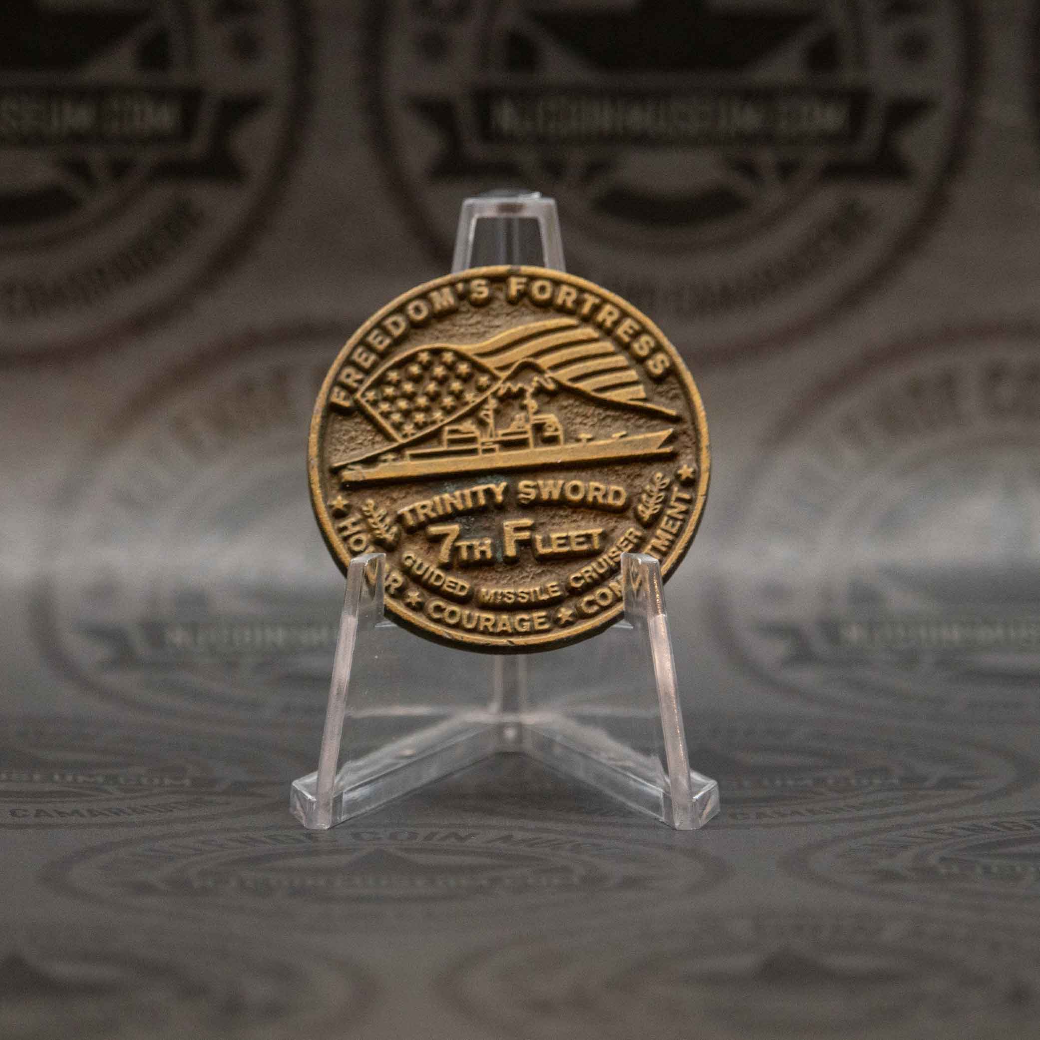 The USS Vincennes (CG‑49) challenge coin is a proud symbol of service to the Ticonderoga-class guided missile cruiser commissioned in July 1985. We invite you to stop in anytime and see this Beautiful Museum! Click HERE for hours and directions. Have a challenge coin we may not have? Bring it in and trade it for our Inaugural