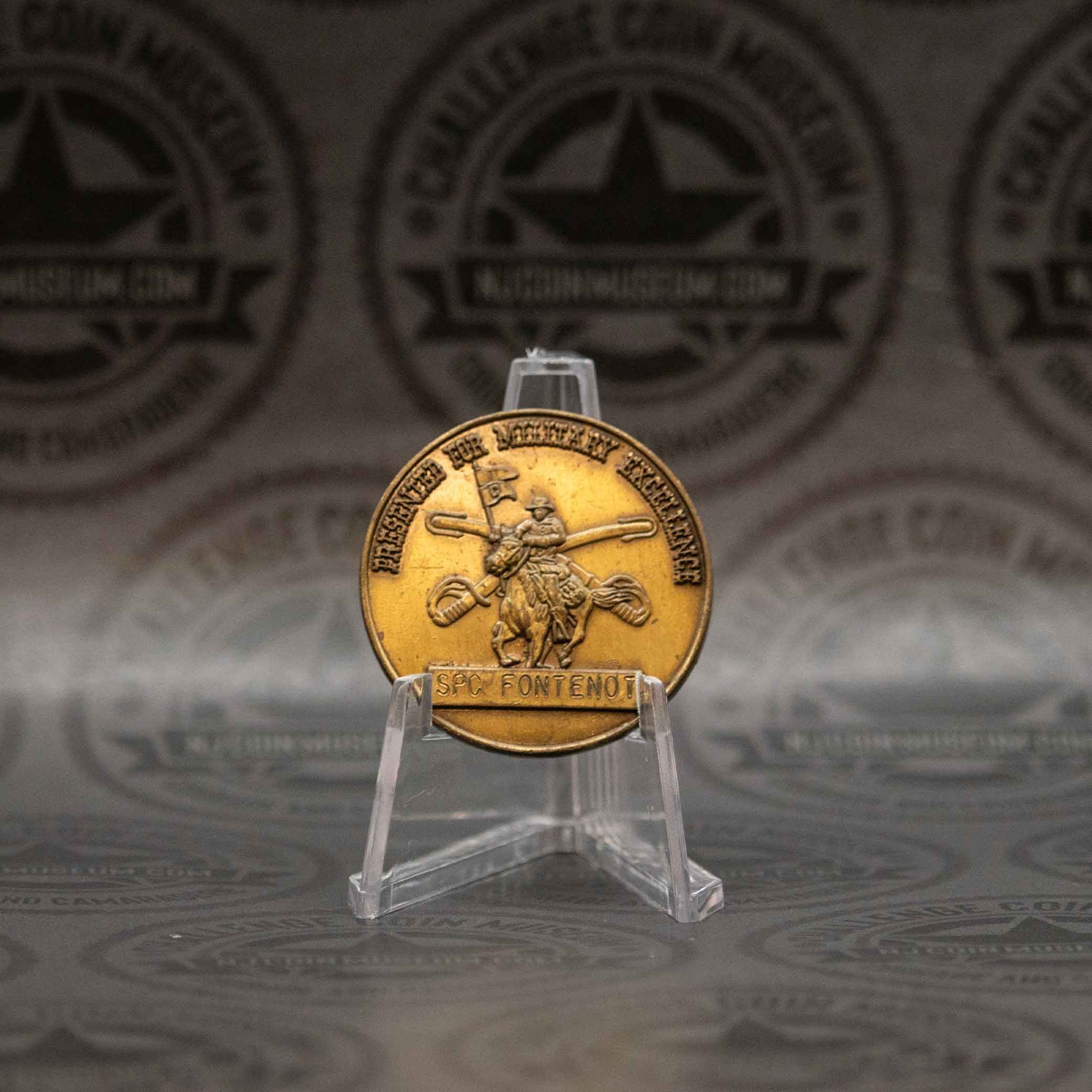 The SPC Fontenot “Presented for Military Excellence” challenge coin typifies a tradition in the U.S. military where coins are personally designed and awarded by unit commanders to recognize exceptional performance. We invite you to stop in anytime and see this Beautiful Museum! Click HERE for hours and directions. Have a challenge coin we may not