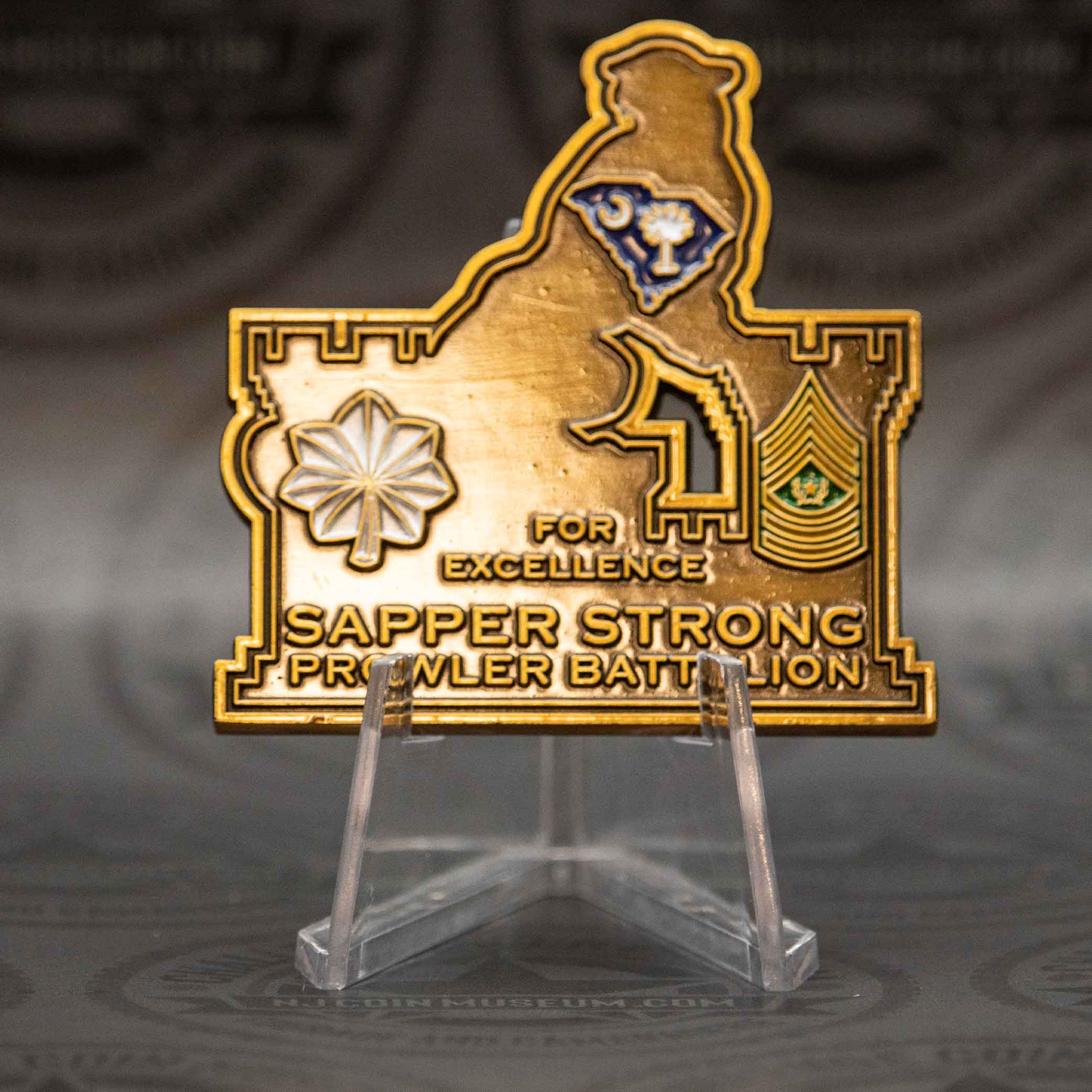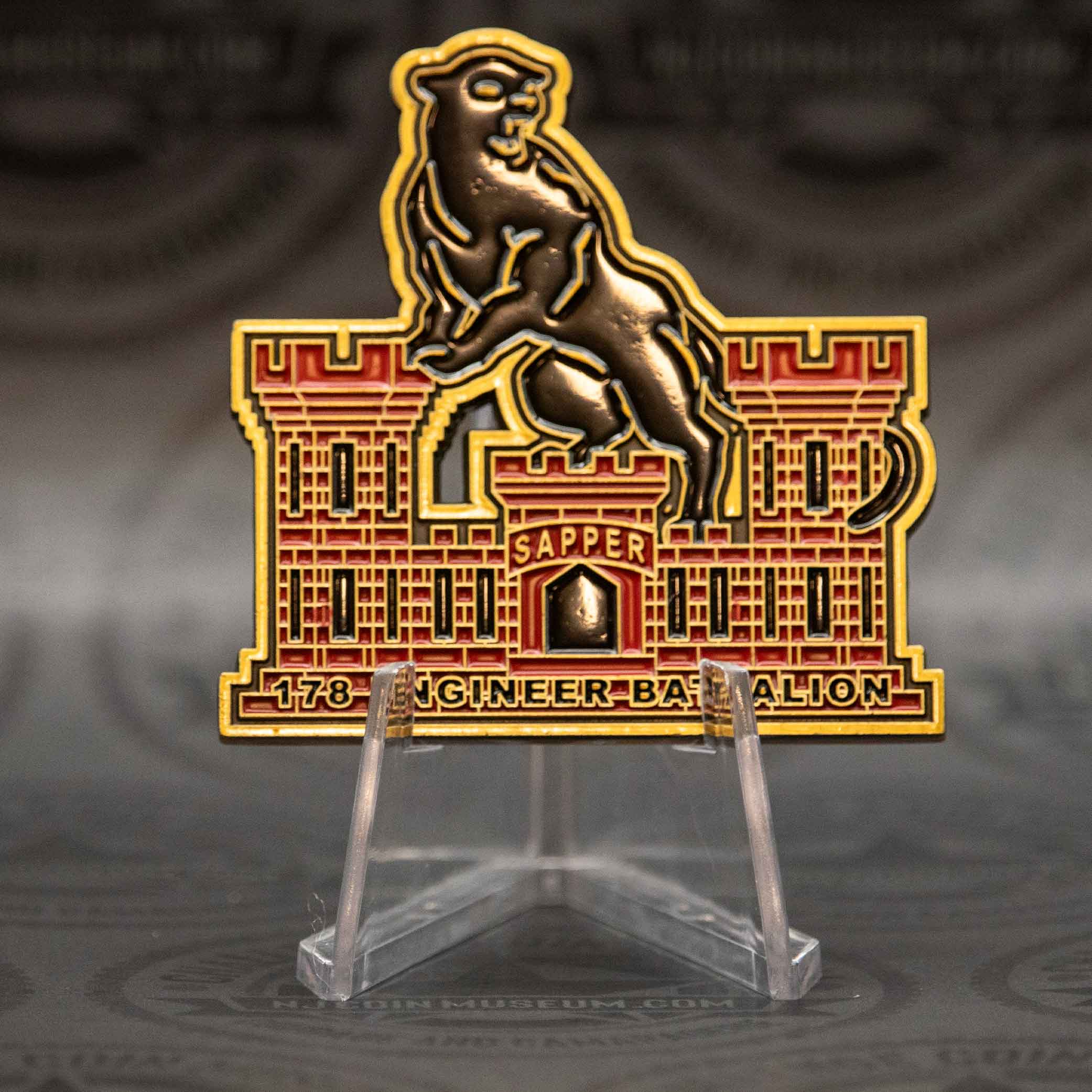 The Sapper 178 Engineer Battalion challenge coin honors the skilled soldiers of the 178th Engineer Battalion, recognizing their expertise, dedication, and vital role in combat engineering missions. Known as “sappers,” these engineers specialize in tasks such as construction, demolition, fortification, and obstacle clearance, often operating in challenging and dangerous environments. We invite you to stop