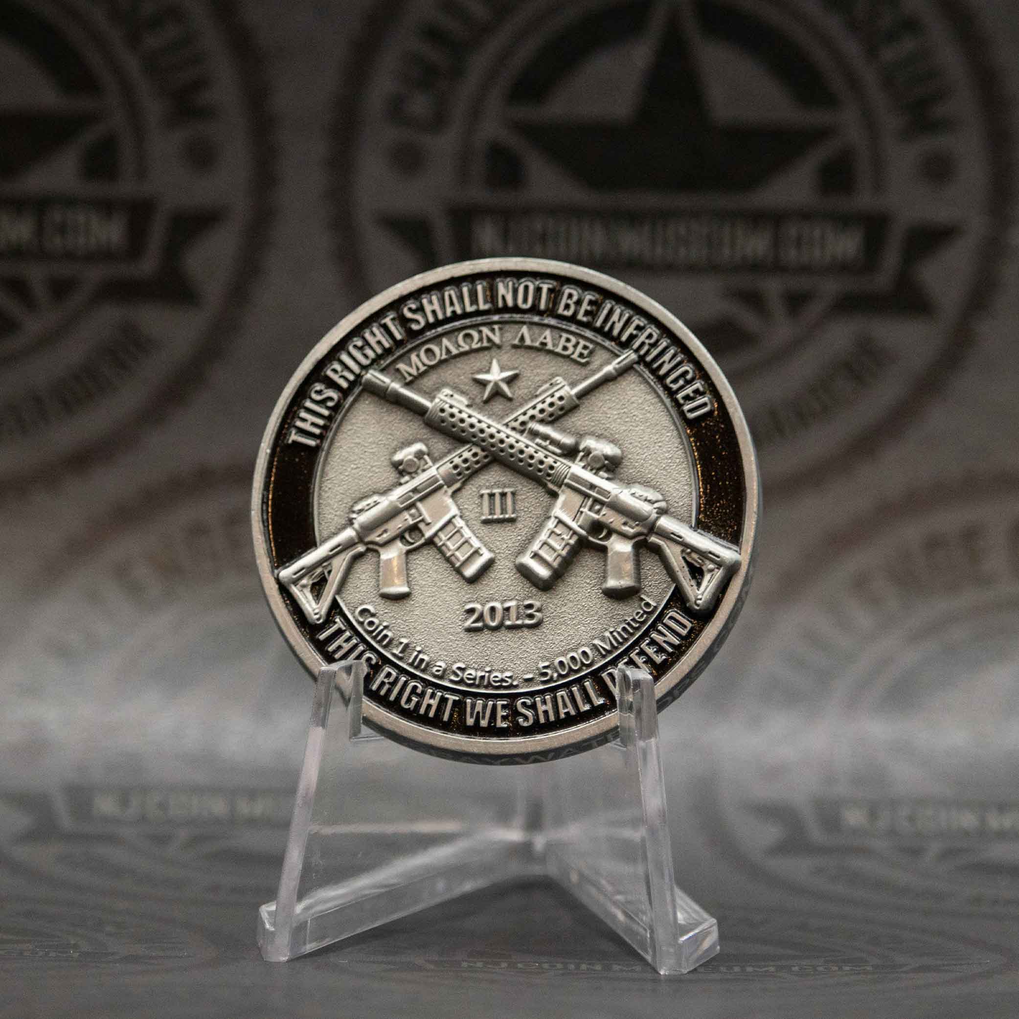 The “Moaon Aabe – This Right Will Not Be Infringed 2013” challenge coin is a commemorative item that blends historical symbolism with modern advocacy for the Second Amendment. The phrase “Moaon Aabe” is a misspelling of the Greek “Molon Labe,” which translates to “Come and take them,” famously attributed to King Leonidas I of Sparta