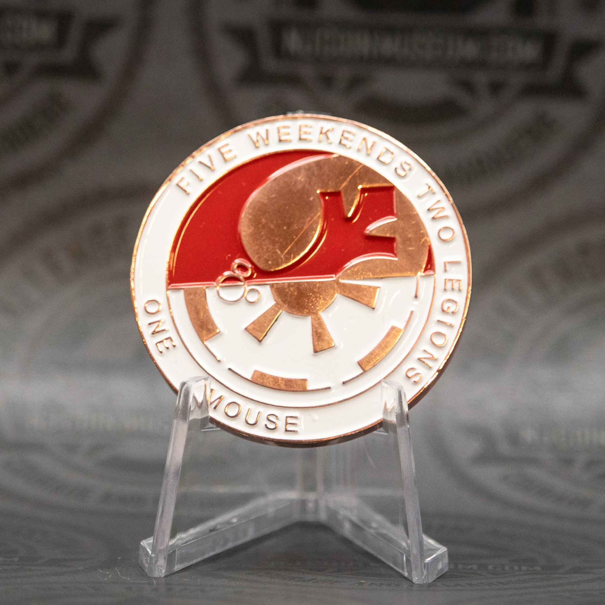 The “Five Weekends, Two Legions, One Mouse” challenge coin is a charming tribute to the dedication and camaraderie of Star Wars fandom, particularly among members of the 501st and Rebel Legion. Crafted to commemorate a fan-driven weekend event that brought together both legions—elite costuming groups devoted to Imperial and Rebel characters—it playfully incorporates “One Mouse”