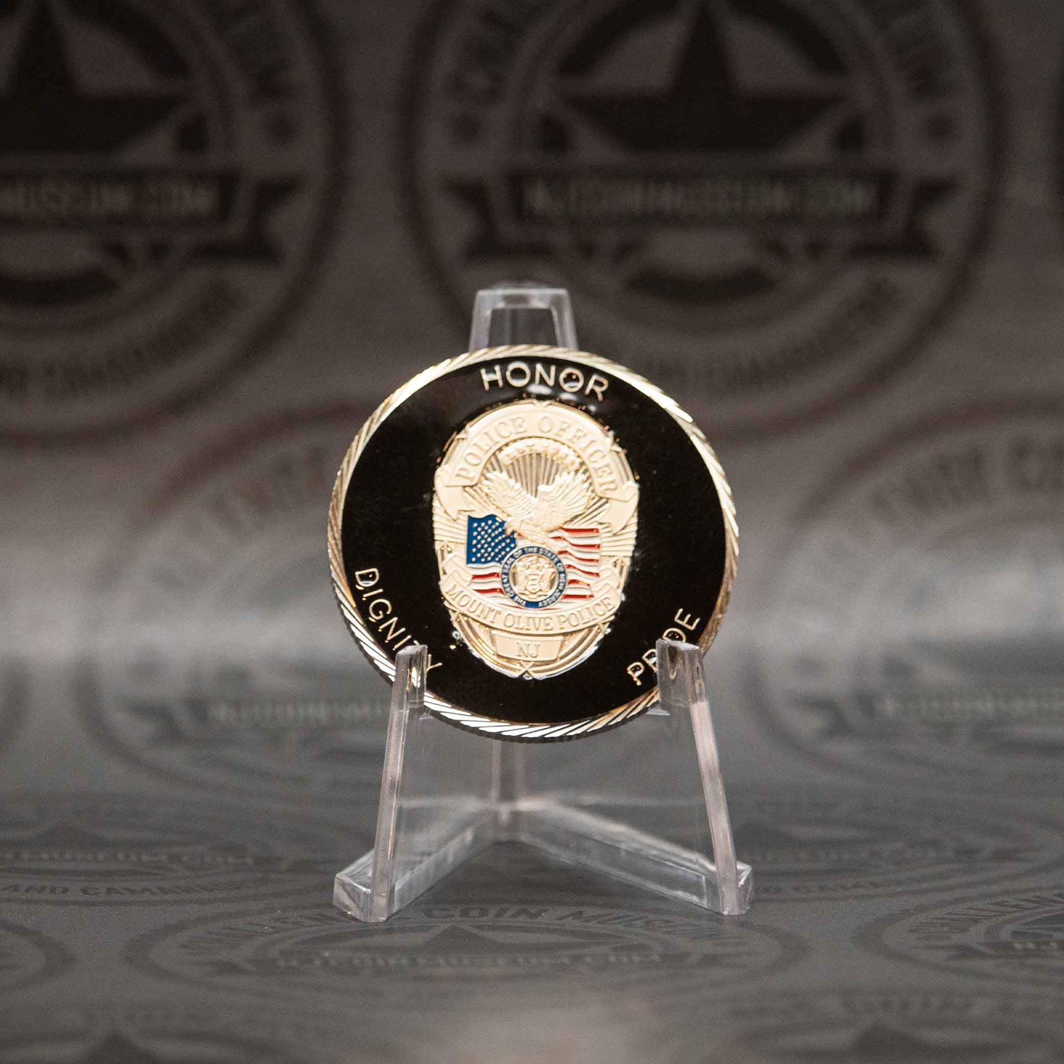 The Mount Olive Township Police Department challenge coin (New Jersey) is a beautifully crafted token reflecting departmental dedication and community partnership. We invite you to stop in anytime and see this Beautiful Museum! Click HERE for hours and directions. Have a challenge coin we may not have? Bring it in and trade it for our
