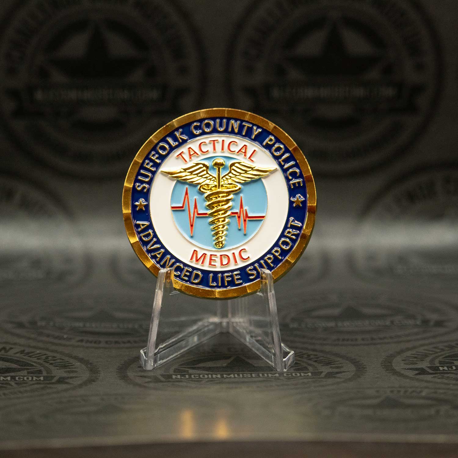 The Suffolk County Police Advanced Life Support Tactical Medic challenge coin represents the elite professionalism and specialized training of medics who serve in high-risk tactical environments. Bearing the insignia and symbols of both law enforcement and emergency medical services, the coin honors those who operate at the intersection of police operations and life-saving care. These