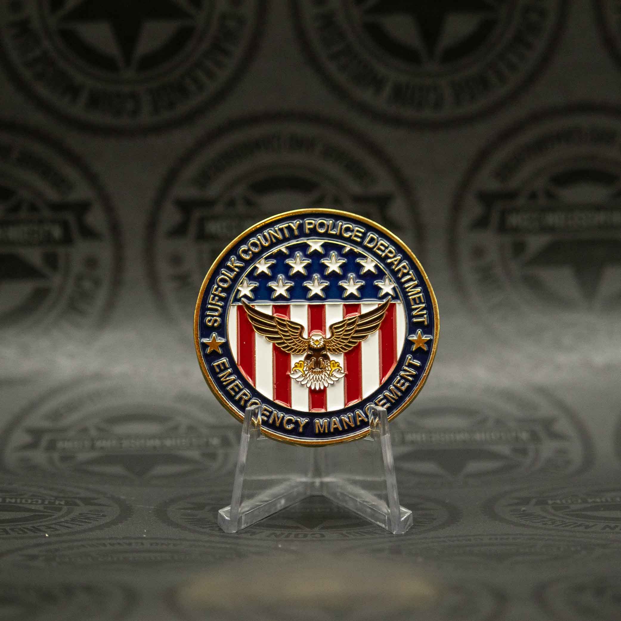 The Suffolk County Police Department Emergency Management challenge coin honors the vital role of those who plan, coordinate, and lead the department’s response to large-scale emergencies and disasters. This unit is responsible for ensuring preparedness and resilience in the face of natural disasters, public health crises, terrorist threats, and other critical incidents. We invite you
