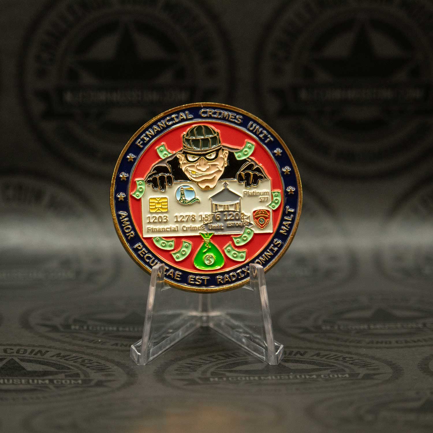 The Suffolk County Police Department Financial Crimes Unit challenge coin represents the specialized expertise and diligence of the detectives who investigate complex financial offenses such as fraud, identity theft, embezzlement, and cybercrime. This unit plays a critical role in protecting the financial well-being of individuals, businesses, and the broader community by tracking illicit monetary activities