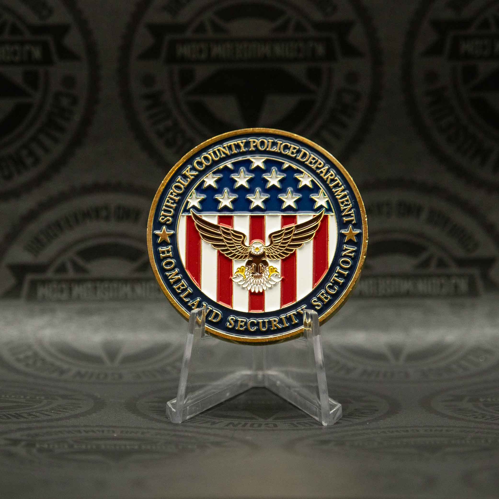 The Suffolk County Police Department Homeland Security Section challenge coin symbolizes the steadfast commitment of the officers and analysts dedicated to protecting the county from terrorism, major threats, and critical infrastructure vulnerabilities. This specialized unit works closely with federal, state, and local agencies to detect, prevent, and respond to both domestic and international threats. We