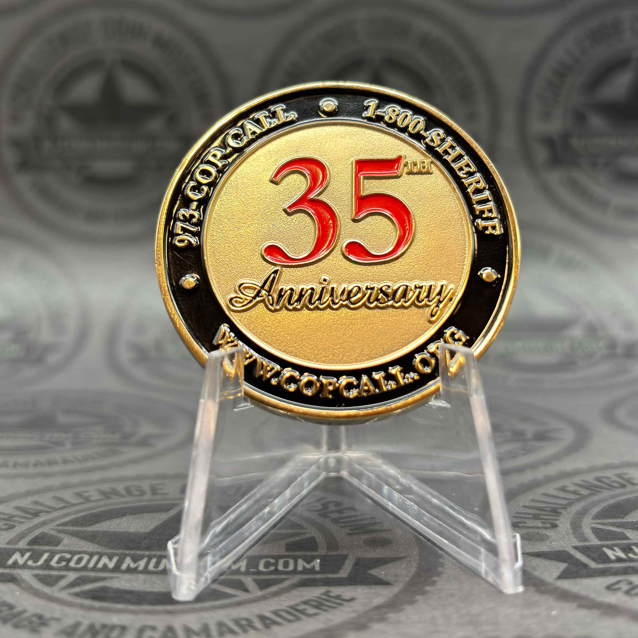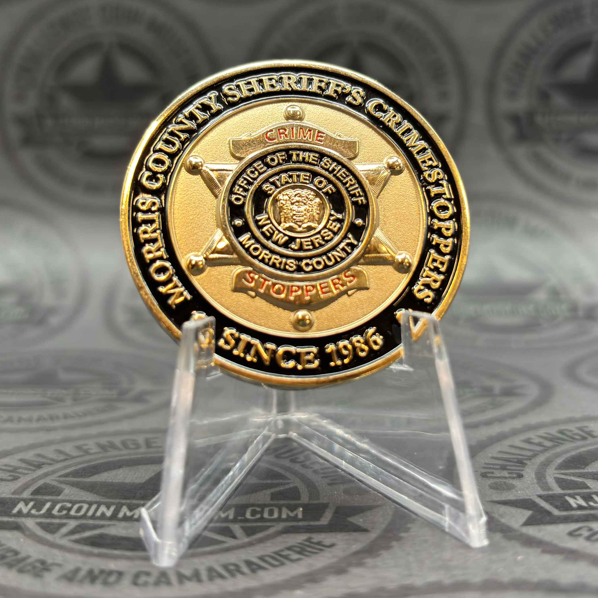 The Morris County Sheriff’s CrimeStoppers 35th Anniversary challenge coin celebrates over three decades of community partnership in fighting crime and promoting public safety. Designed to honor the program’s mission of empowering residents to anonymously share vital tips, the coin symbolizes trust, vigilance, and cooperation between law enforcement and the community. We invite you to stop